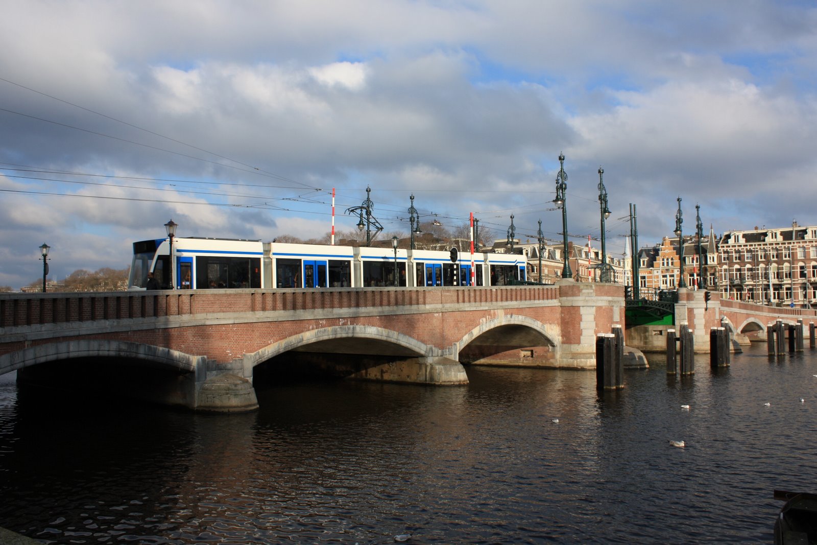 Nieuwe Amstelbrug en tram –electric tram crossing the Nieuwe Amstelbrug