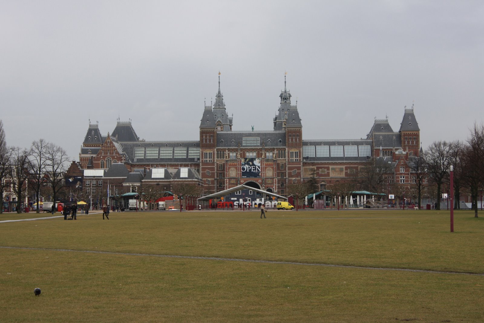 Rijks museum –and the “I Amsterdam” sculpture.taken from the museumplein. themuseum gift shop can be seen at the left. The Van Gogh Museum is out of camerato the left.