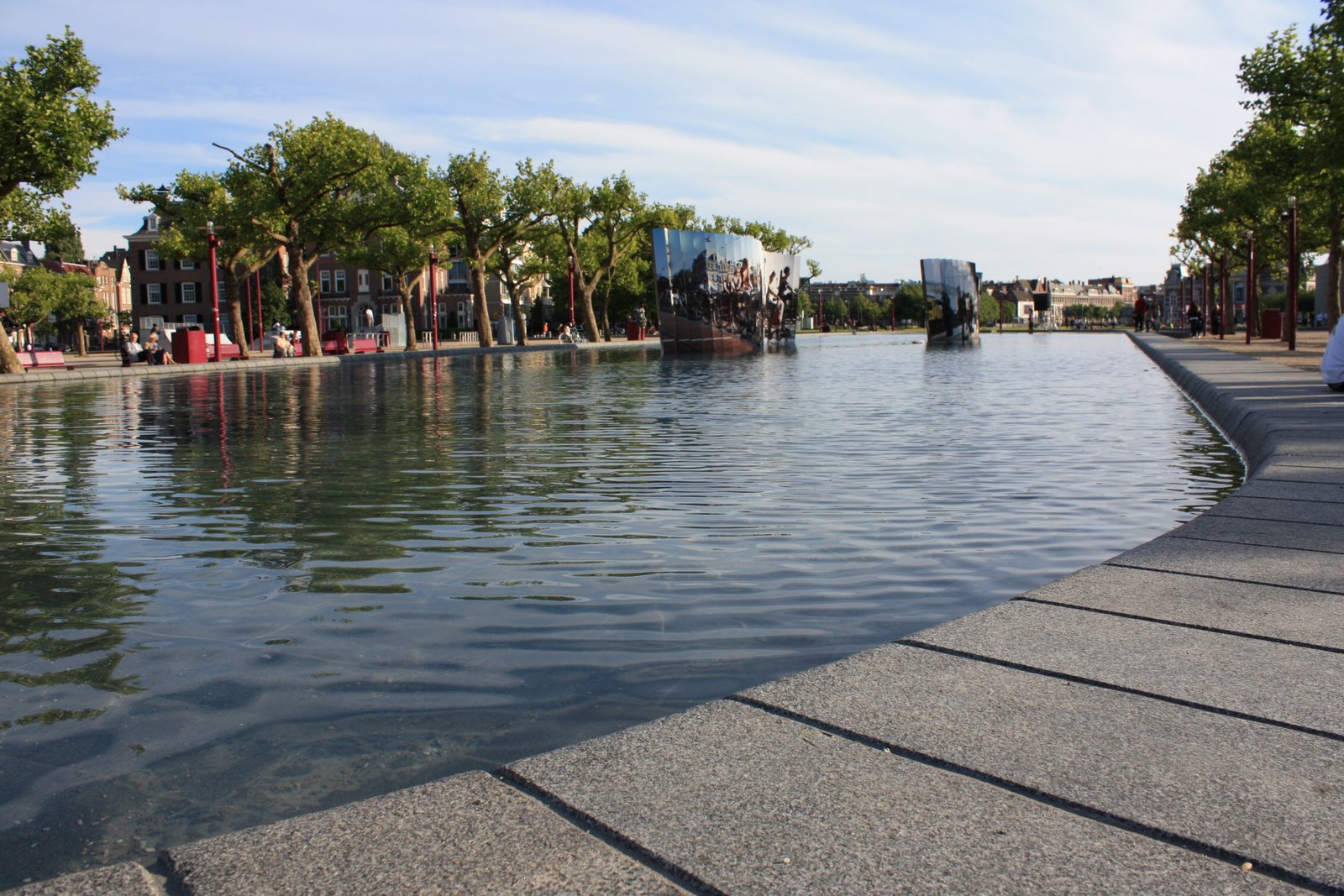 Museumplein – museum square or plaza art in the fountain. taken from the Rijksmuseum at the iAmsterdam sign looking toward the Van Gogh museum