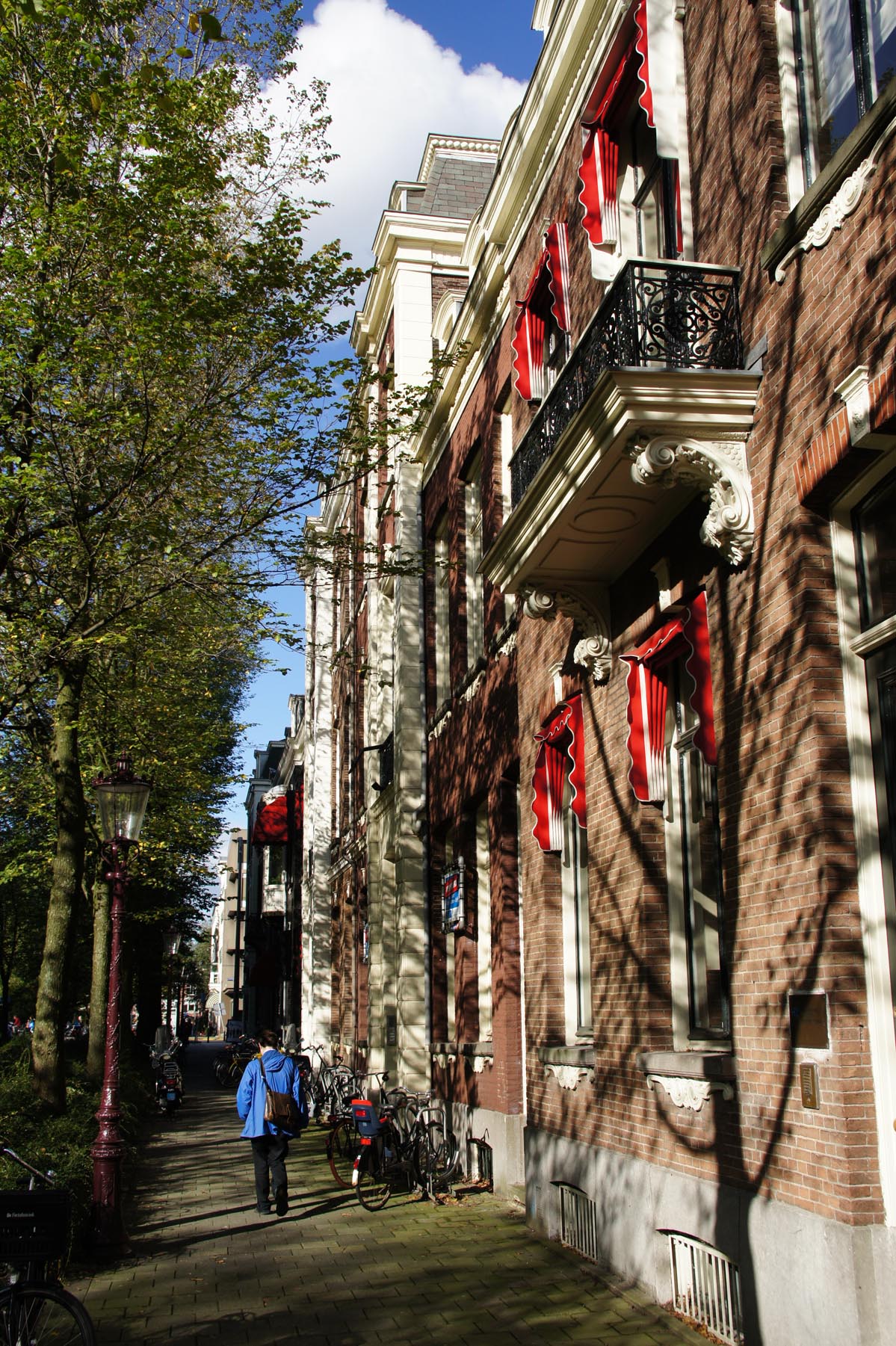- Light and shadow, brick and red awnings.