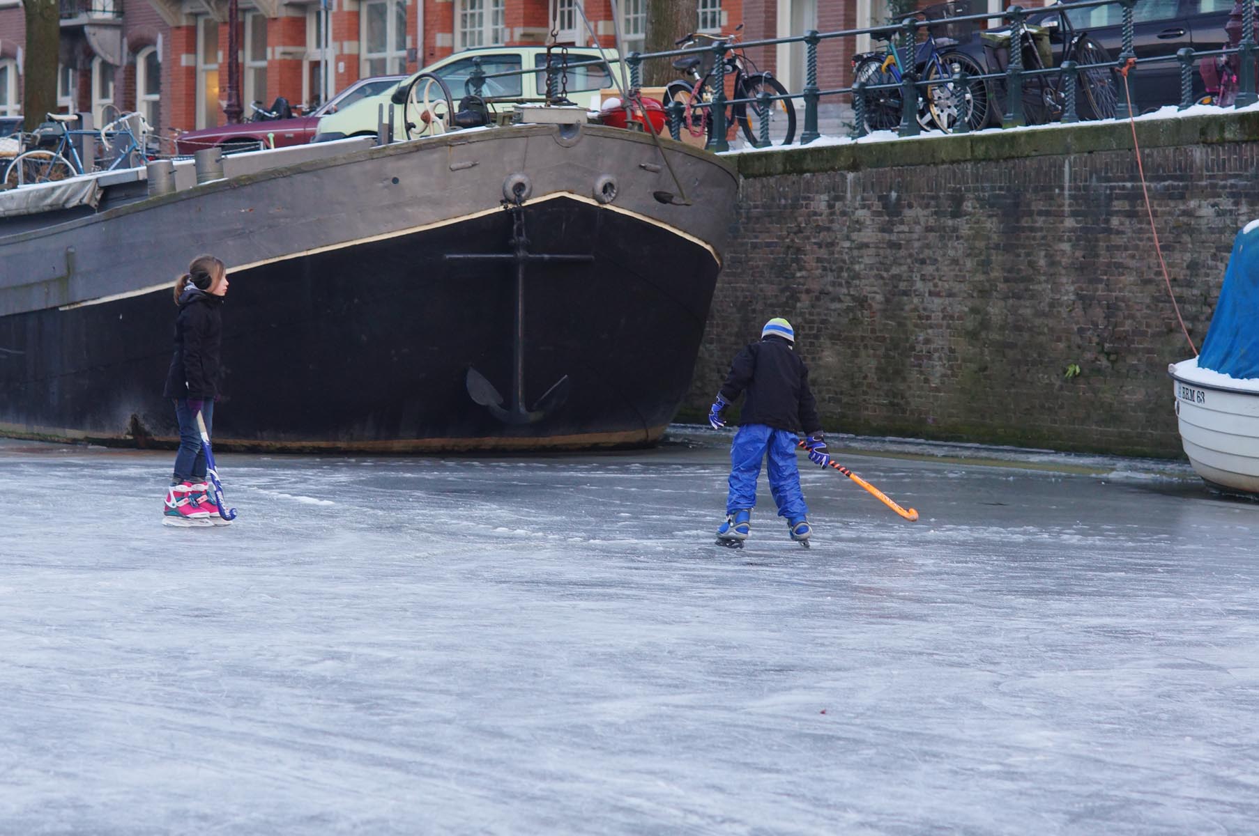 - Neighbors playing hockey on the Nieuwe Prinsengracht